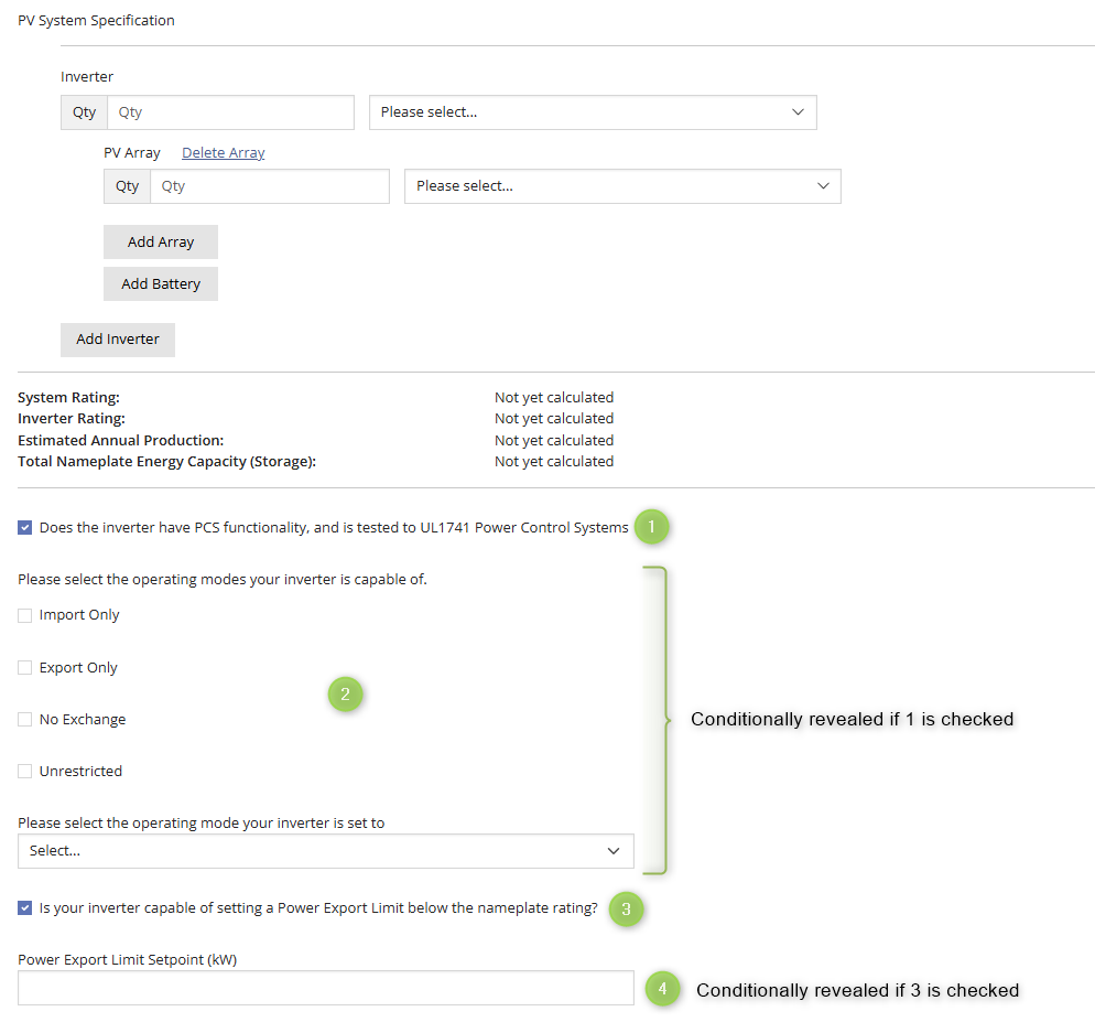 (Unrestricted, Export Only, Import Only, No Exchange) - A 2nd checkbox asking if the PCS will be setting the inverter to a lower power setting than the listed equipment